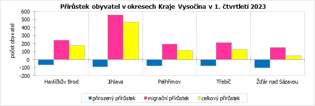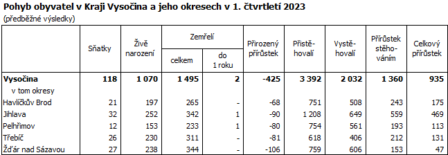 V průběhu prvních tří měsíců roku 2023 se v Kraji Vysočina živě narodilo 1 070 dětí, téměř o 140 méně než ve stejném období předchozího roku. V lednu až březnu 2023 na Vysočině zemřelo 1 495 osob, tedy téměř stejně jako v 1. čtvrtletí roku 2022 i posledního „předcovidového“ roku 2019. Počet zemřelých převýšil počet narozených ve všech okresech kraje, nejvýrazněji na Žďársku (přirozený úbytek -106 obyvatel). Nejmírnější byl pokles počtu obyvatel přirozenou měnou v okrese havlíčkův Brod (-68 osob).
