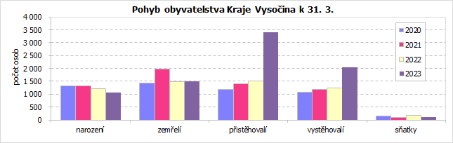 Ke konci března 2023 žilo v Kraji Vysočina podle předběžných výsledků 515 712 obyvatel, což bylo oproti stavu na začátku roku o 935 osob více (v mezikrajském srovnání solidní přírůstek). Počet mužů se v kraji zvýšil o 390, žen přibylo 545. Za celkovým populačním přírůstkem stojí výhradně vysoce kladné migrační saldo, které částečně zredukoval značný úbytek obyvatel přirozenou měnou. Do kraje se přistěhovalo 3 392 osob, vystěhovalých bylo 2 032. Živě se v kraji v prvních třech měsících roku 2023 narodilo 1 070 dětí, z toho 46,8 % mimo manželství (v meziročním srovnání o 1,2 procentního bodu více). Ve stejném období zemřelo 1 495 osob, přirozenou měnou tak ubylo 425 obyvatel.