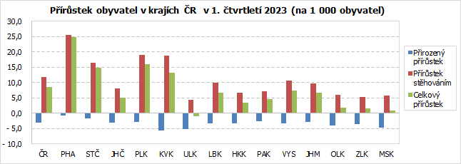 Celkový nárůst počtu obyvatel byl v lednu až březnu 2023 zaznamenán s jedinou výjimkou ve všech regionech České republiky. Počet obyvatel České republiky se zvýšil o více než třiadvacet tisíc osob, přírůstek se ovšem jako obvykle koncentroval především do Prahy a Středočeského kraje, ve kterých dohromady přibylo více než 13,5 tisíce obyvatel. Výrazněji též narostla populace Plzeňského a Jihomoravského kraje. Jediným krajem, kde došlo k úbytku obyvatel, byl Ústecký (-184). V přepočtu na tisíc obyvatel středního stavu nejvíce obyvatel získala Praha (24,8), více než deset osob na tisíc obyvatel činil celkový přírůstek ještě v krajích Středočeském, Plzeňském a Karlovarském.