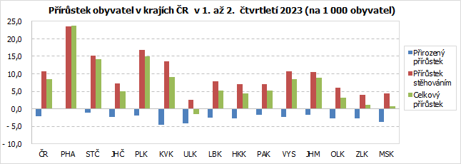 Celkový nárůst počtu obyvatel byl v lednu až červnu 2023 zaznamenán s jedinou výjimkou ve všech regionech České republiky. Počet obyvatel České republiky se zvýšil o více než 46 tisíc osob, přírůstek se ovšem jako obvykle koncentroval především do Prahy a Středočeského kraje, ve kterých dohromady přibylo více než 26 tisíc obyvatel. Výrazněji též narostla populace Jihomoravského a Plzeňského kraje. Jediným krajem, kde došlo k úbytku obyvatel, byl Ústecký (-631). V přepočtu na tisíc obyvatel středního stavu nejvíce obyvatel získala Praha (23,7), více než deset osob na tisíc obyvatel činil celkový přírůstek ještě v krajích Středočeském a Plzeňském.