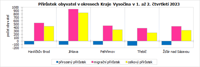 V průběhu prvních šesti měsíců roku 2023 se v Kraji Vysočina živě narodilo 2 235 dětí, téměř o 300 méně než ve stejném období předchozího roku. V lednu až červnu 2023 na Vysočině zemřelo 2 809 osob, tedy zhruba o padesát méně než v 1. pololetí roku 2022 a o 86 méně než v posledním „předcovidovém“ roce 2019. Počet zemřelých převýšil počet narozených ve všech okresech kraje, nejvýrazněji na Třebíčsku (přirozený úbytek -132 obyvatel). Nejmírnější byl pokles počtu obyvatel přirozenou měnou v okrese havlíčkův Brod (-103 osob).