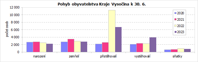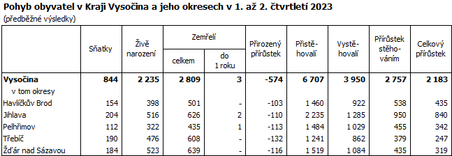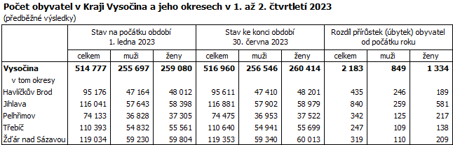 Ke konci června 2023 žilo v Kraji Vysočina podle předběžných výsledků 516 960 obyvatel, což bylo oproti stavu na začátku roku o 2 183 osob více (v mezikrajském srovnání velmi solidní přírůstek). Počet mužů se v kraji zvýšil o 849, žen přibylo 1 334. Za celkovým populačním přírůstkem stojí výhradně vysoce kladné migrační saldo, které částečně zredukoval značný úbytek obyvatel přirozenou měnou. Do kraje se přistěhovalo 6 707 osob, vystěhovalých bylo 3 950. Živě se v kraji v prvních šesti měsících roku 2023 narodilo 2 235 dětí, z toho 46,0 % mimo manželství (v meziročním srovnání o 0,2 procentního bodu více). Ve stejném období zemřelo 2 809 osob, přirozenou měnou tak ubylo 574 obyvatel.