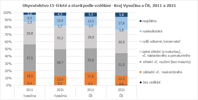Při porovnání s daty ze Sčítání 2011 je zřejmá rostoucí vzdělanostní úroveň obyvatelstva Vysočiny. Počet vysokoškolsky vzdělaných osob se od předchozího sčítání zvýšil o 37,1 %, vzrostl i počet osob s dosaženým úplným středoškolským vzděláním s maturitou, a to o 1,1 %.