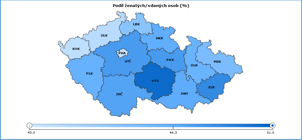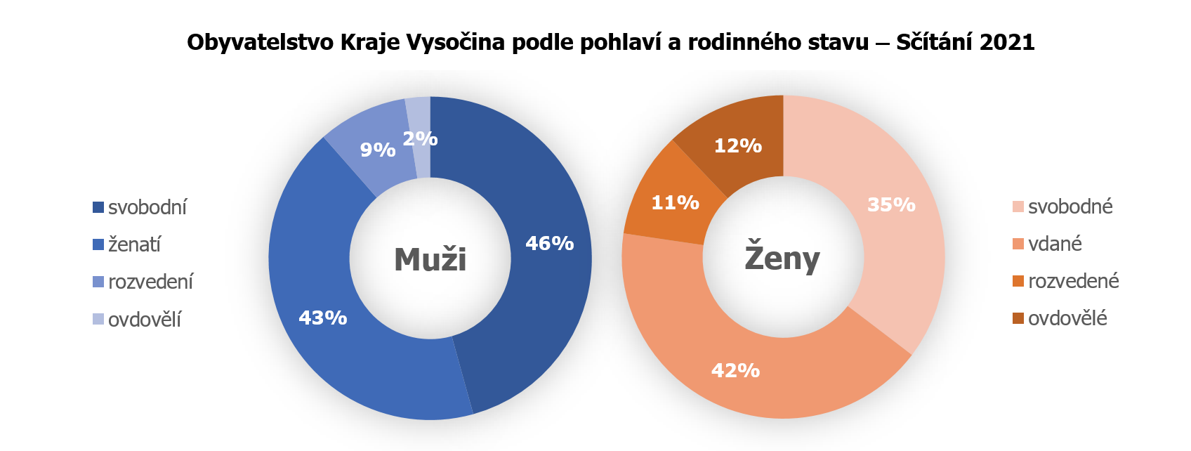 Stejně jako v celé republice i na Vysočině v populaci mírně převládají ženy, na Vysočině mají podíl 50,3 %, republikový podíl žen činí 50,7 %. Mezikrajská prvenství zaujímá obyvatelstvo Vysočiny ve statistikách týkajících se rodinného stavu - svobodní tvoří nejmenší část populace (29,2 %), osoby žijící v manželství mají mezi obyvateli nejvyšší podíl (50,4 %) a nejnižší podíl zaujímají na Vysočině rozvedení (11,6 %).
