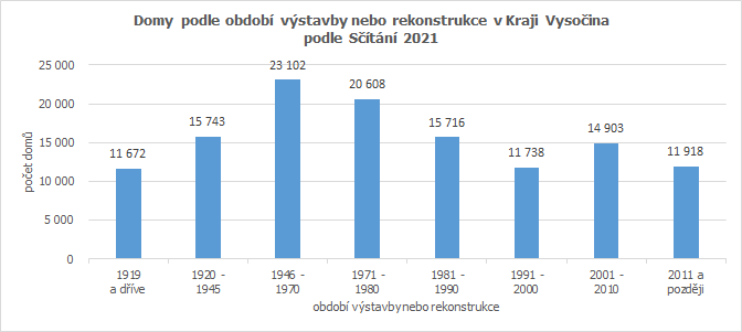 V Kraji Vysočina bylo podle Sčítání 2021 celkem 146 174 domů, což znamená 6,9 % nárůst počtu domů v kraji oproti předchozímu sčítání. Od Sčítání 1991 roste počet domů mezi jednotlivými sčítáními podobným tempem (6 – 8 %). Z hlediska vlastnictví v kraji převládají domy ve vlastnictví fyzické osoby (91,4 %), což koresponduje s rozdrobenou sídelní strukturou kraje. Následují domy ve spoluvlastnictví vlastníků bytů (4,3 %), domy jiných právnických osob, domy vlastněné obcemi či státem (v obou případech kolem 1,5 %) a menší než 1 % zastoupení mají domy ve vlastnictví bytových družstev a domy s různými kombinacemi vlastníků. Podle období výstavby či rekonstrukce převažují v našem kraji domy z období po druhé světové válce a z výstavby v desetiletí 1971 – 1980. Po vzniku samostatné České republiky se do domovního fondu výrazněji promítla výstavba nebo rekonstrukce domů v desetiletí 2001 – 2010.