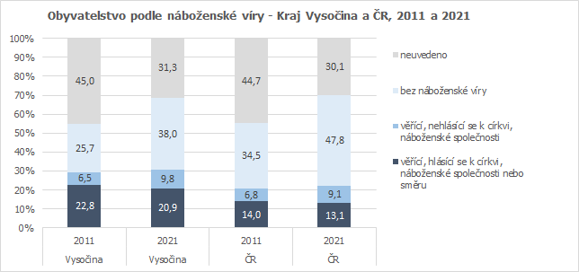 Republikově nadprůměrných hodnot dosahuje obyvatelstvo Vysočiny také v zastoupení věřících hlásících se k církvi nebo náboženské společnosti. Nutno však připomenout, že vyplnění odpovědi na otázku náboženské víry bylo v dotazníku čistě dobrovolné, což se odráží v míře neodpovědí. Nevyplněnou otázku náboženské víry nechalo 30,1 % osob v republice a 31,3 % obyvatel Vysočiny.