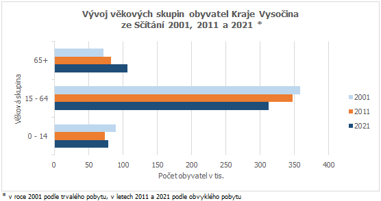 Z dat zjištěných při Sčítání 2021 vyplývá, že na území Kraje Vysočina žilo v rozhodný okamžik 79 198 dětí, tj. 15,9 % populace. Obyvatel v produktivním věku, resp. ve věkové skupině 15 – 64 let bylo v kraji celkem 312 024 (62,7 %). Věková skupina obyvatel ve věku 65 a více let čítá na Vysočině 106 439 (21,4 %) osob.