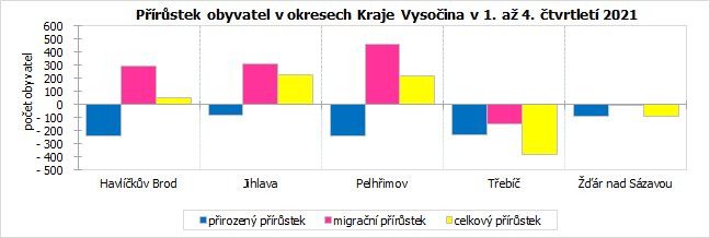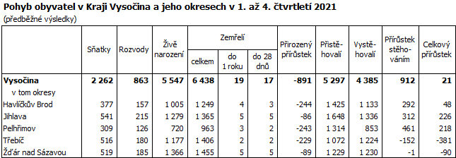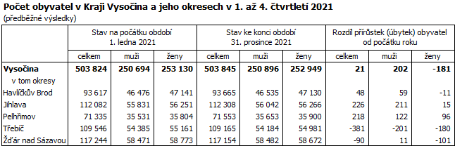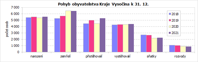 Ke konci prosince 2021 žilo v Kraji Vysočina podle předběžných výsledků 503 845 obyvatel, což bylo oproti stavu na začátku roku o 21 osob více, (v mezikrajském srovnání osmý nejvyšší přírůstek). Počet mužů se v kraji zvýšil o 202, žen ubylo 181. Za celkovým nepatrným populačním nárůstem stojí výhradně vysoké kladné migrační saldo, které dokázalo mírně převážit výrazný úbytek obyvatel přirozenou měnou. Do kraje se přistěhovalo 5 297 osob, vystěhovalých bylo 4 385. Živě se v kraji v dvanácti měsících roku 2021 narodilo 5 547 dětí, z toho 45,8 % mimo manželství (v meziročním srovnání o 0,2 procentního bodu více). Ve stejném období zemřelo 6 438 osob, přirozenou měnou tak ubylo 891 obyvatel.