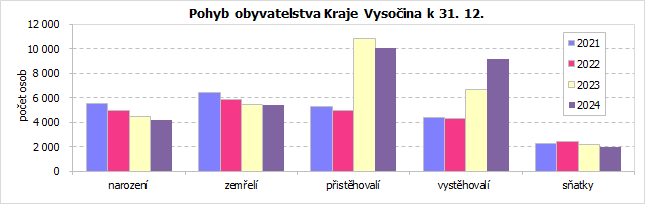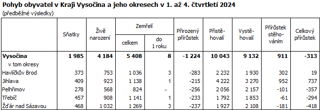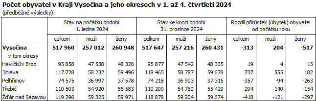 Ke konci prosince 2024 žilo v Kraji Vysočina podle předběžných výsledků 517 647 obyvatel, což bylo oproti stavu na začátku roku o 313 osob méně (v mezikrajském srovnání spíše mírný úbytek). Počet mužů se v kraji zvýšil o 204, žen ubylo 517. Za celkovým populačním úbytkem stojí především značný úbytek obyvatel přirozenou měnou, který nedokázalo vyvážit kladné migrační saldo. Do kraje se přistěhovalo 10 043 osob, vystěhovalých bylo 9 132. Živě se v kraji ve dvanácti měsících roku 2024 narodilo 4 184 dětí, z toho 44,6 % mimo manželství (v meziročním srovnání o 0,6 procentního bodu více). Ve stejném období zemřelo 5 408 osob, přirozenou měnou tak ubylo 1 224 obyvatel.