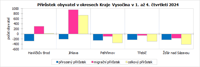 Celkový úbytek populace se projevil ve třech okresech kraje, nejvíce obyvatel ztratily pelhřimovský (-357) a žďárský okres (-418). Ve všech těchto okresech obyvatel ubylo nejen díky zápornému migračnímu saldu, ale hlavně v důsledku značného přirozeného úbytku. Obyvatel přibylo v okresech Havlíčkův Brod a zejména Jihlava (o 737 osob), vesměs díky přírůstku stěhováním.