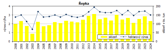 Sklizeň řepky byla oproti roku 2023 o 18,3 % nižší. Meziročně byly osevní plochy řepky poníženy, a to o 2 787 hektarů, tj. o 6,8 %, nižší byl i hektarový výnos (-12,3 %). Sklidilo se téměř 116 tisíc tun. Větší objem řepky byl sklizen pouze ve Středočeském (téměř 201 tisíc tun) a Jihočeském (přes 116 tis. tun) kraji. Sklizeň máku, druhé nejčastější olejniny na Vysočině, se meziročně zvýšila o více než polovinu (+56,2 %). Sklizených 6 tis. tun máku znamená nejvyšší sklizeň mezi kraji a více než pětinu sklizně máku v republice.
