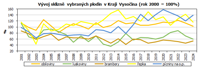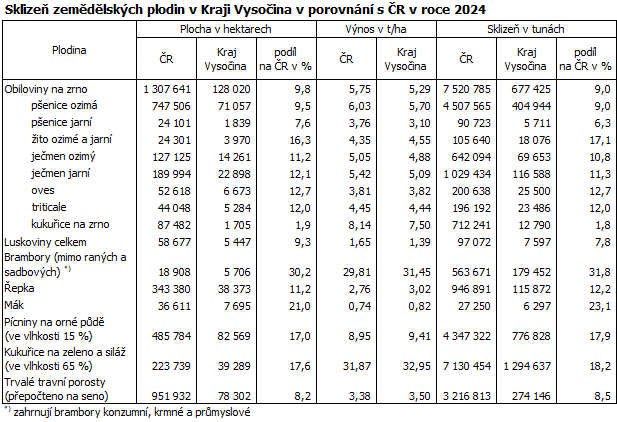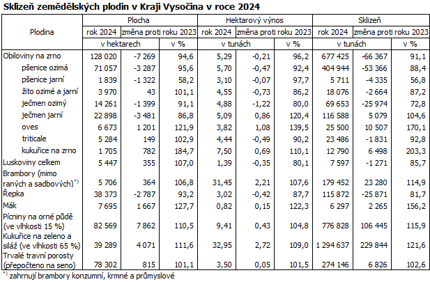 V roce 2024 se v Kraji Vysočina sklidilo 677 tisíc tun obilovin, bezmála desetina sklizně v ČR (9 %). Meziročně se sklizeň obilovin v kraji snížila o 66 tisíc tun (-8,9 %). Více než polovinu (59,8 %) ze sklizně obilovin tvořila pšenice ozimá (405 tisíc tun), druhou nejrozšířenější obilovinou byl ječmen jarní (117 tisíc tun). Brambor se sklidilo více o 23 tisíc tun (+14,9 %) než v předchozím roce, přes 179 tisíc tun. Meziroční pokles o téměř 26 tisíc tun (-18,3 %) byl vykázán ve sklizni řepky, které se sklidilo necelých 116 tisíc tun.