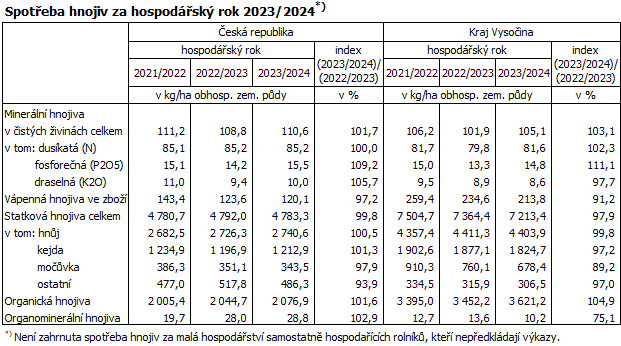 V hospodářském roce 2023/2024 spotřebovali zemědělci na Vysočině 105 kg minerálních hnojiv v čistých živinách na 1 ha zemědělské půdy (o 5,5 kg méně než v celé ČR), z toho více než tři čtvrtiny tvořila hnojiva dusíkatá. Spotřeba statkových hnojiv představovala celkem 7,2 tis. kg/ha, z čehož více než polovina (61 %) připadá na hnůj. Vápenných hnojiv bylo spotřebováno asi 214 kg/ha, tj. výrazně více než činí průměr ČR.
