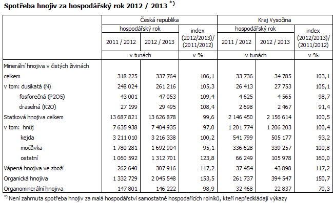 V hospodářském roce 2012/2013 spotřebovali zemědělci na Vysočině téměř 35 tisíc tun minerálních hnojiv v čistých živinách, z toho 80 % tvořila hnojiva dusíkatá. Spotřeba statkových hnojiv představovala celkem 2 157 tisíc tun, přičemž více jak polovina připadá na hnůj. Vápenných hnojiv bylo spotřebováno více jak 43 tisíc tun.