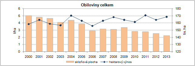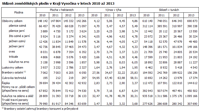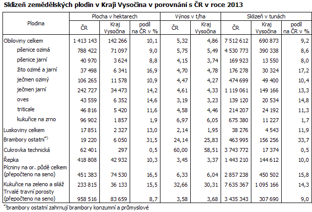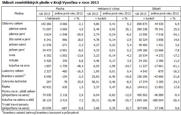 Celková sklizeň obilovin na Vysočině v roce 2013 ve výši téměř 691 tisíc tun byla třetí nejvyšší v rámci České republiky za Středočeským a Jihomoravským krajem. Podíl kraje na celkové sklizni obilovin v republice činil 9,2 %. Oproti předchozímu roku se zvýšila sklizeň obilovin v kraji o 6,9 %, v celé ČR činil nárůst 13,9 %. Větší produkce obilovin na Vysočině byla v roce 2013 způsobena vyšším hektarovým výnosem, který proti předchozímu roku vzrostl o 0,41 tun z hektaru. Naopak výměra obilovin se zmenšila o více než 3 000 hektarů.