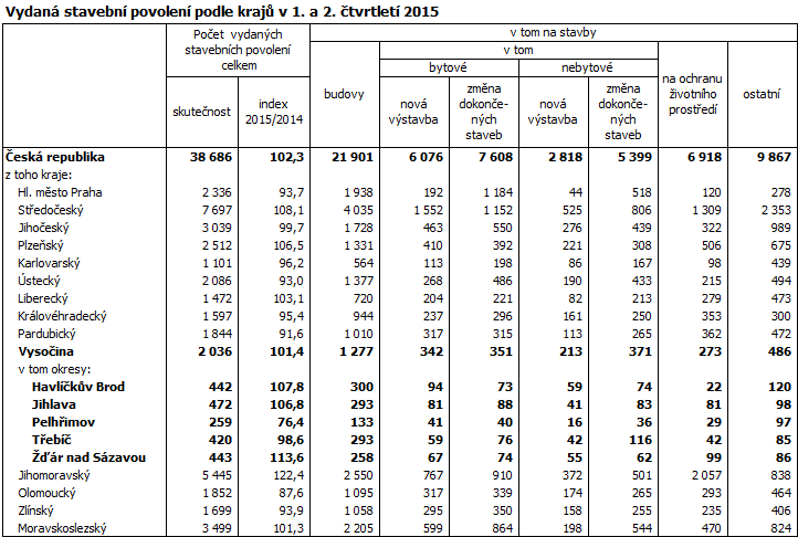 V Kraji Vysočina bylo v prvních šesti měsících roku 2015 vydáno 2 036 stavebních povolení. V mezikrajském srovnání to byl sedmý nejvyšší počet a jedná se o 5,3 % všech povolení vydaných v celé České republice. Proti stejnému období roku 2014 to představuje zvýšení o 29 povolení (o 1,4 %), ve srovnání s celorepublikovou úrovní je to nárůst o 0,9 procentního bodu nižší. Na budovy s byty bylo v kraji vystaveno 34,0 % povolení, na nebytové stavby připadlo 28,7 %, na stavby týkající se ochrany životního prostředí 13,4 % a na ostatní stavby 23,9 %.