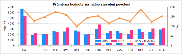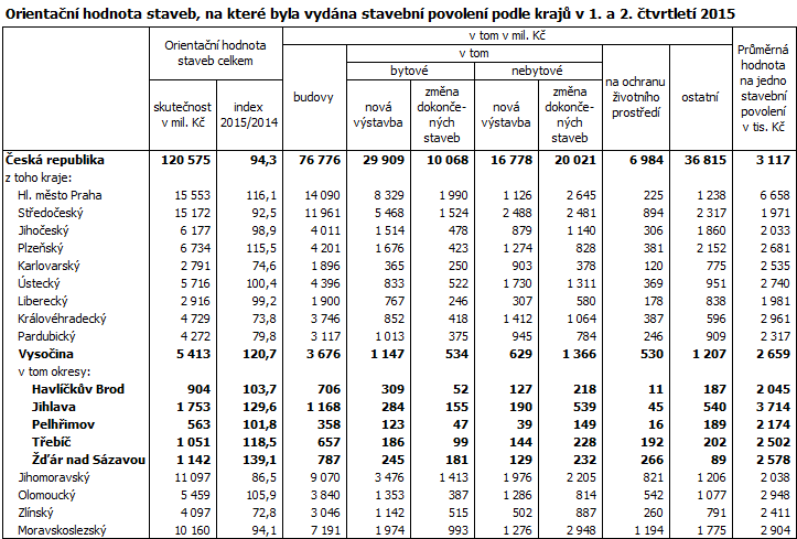 Průměrná hodnota na jedno stavební povolení činila v 1. a 2. čtvrtletí 2015 na Vysočině 2 659 tis. Kč, což je sice pod republikovou úrovní (3 117 tis. Kč), mezi kraji se ale jedná o sedmou nejvyšší hodnotu. V rámci Vysočiny byla nejvyšší orientační hodnota na jedno stavební povolení evidována v okrese Jihlava (3 714 tis. Kč) a nejnižší v okrese Havlíčkův Brod (2 045 tis. Kč).