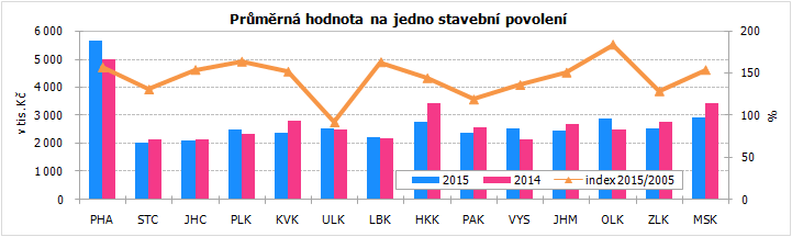 Průměrná hodnota na jedno stavební povolení činila v 1. až 3. čtvrtletí 2015 na Vysočině 2 539 tis. Kč, což je sice pod republikovou úrovní (3 144 tis. Kč), mezi kraji se ale jedná o pátou nejvyšší hodnotu. V rámci Vysočiny byla nejvyšší orientační hodnota na jedno stavební povolení evidována v okrese Jihlava (3 338 tis. Kč) a nejnižší v okrese Pelhřimov (2 097 tis. Kč).