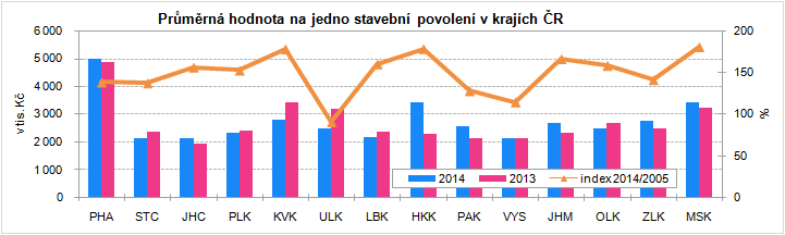 Průměrná hodnota na jedno stavební povolení činila v lednu až září 2014 na Vysočině 2 138 tis. Kč, což je výrazně pod republikovou úrovní (3 205 tis. Kč) a mezi kraji se jedná o druhou nejnižší hodnotu za Jihočeským krajem. V rámci Vysočiny byla nejvyšší orientační hodnota na jedno stavební povolení evidována v okrese Jihlava (2 718 tis. Kč) a nejnižší v okrese Pelhřimov (1 789 tis. Kč).