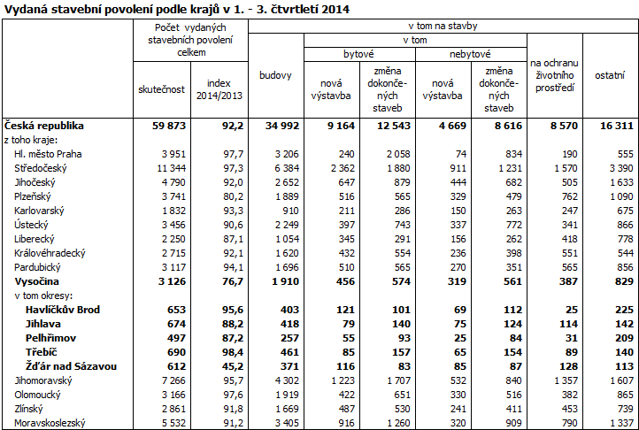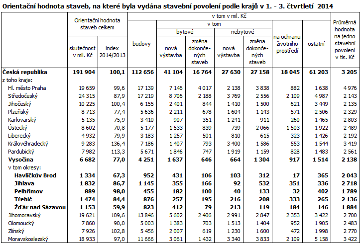 Orientační hodnota staveb, na které bylo v Kraji Vysočina v 1. až 3. čtvrtletí 2014 vydáno povolení, dosáhla výše 6 682 mil. Kč, kraj se tak zařadil na dvanácté místo v mezikrajském srovnání. Oproti stejnému období roku 2013 se na Vysočině orientační hodnota staveb snížila o 1 993 mil. Kč (o 23,0 %). Oproti prvním devíti měsícům roku 2013 se orientační hodnota staveb zvýšila v pěti regionech, nejvýrazněji v Královéhradeckém kraji.