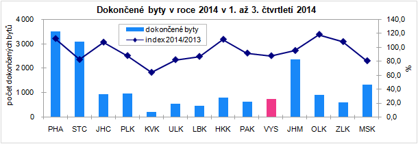 Počet dokončených bytů se v Kraji Vysočina v 1. až 3. čtvrtletí roku 2014 oproti předchozímu roku snížil, tento pokles je navíc nižší než na celorepublikové úrovni (o 6,8 procentního bodu). V kraji byla dokončena výstavba 736 bytů, což znamená meziroční pokles o 12,4 %. Zvýšení počtu dokončených bytů oproti stejnému období předchozího roku bylo zaznamenáno pouze v pěti regionech, nejvýrazněji v Olomouckém kraji (o 18,3 %). Naopak nejvíce se počet dokončených bytů snížil v Karlovarském kraji (o 36,2 %), v celé České republice poklesl tento ukazatel bytové výstavby o 5,6 %.