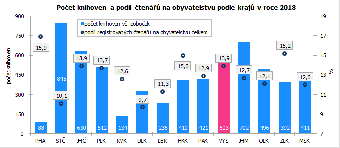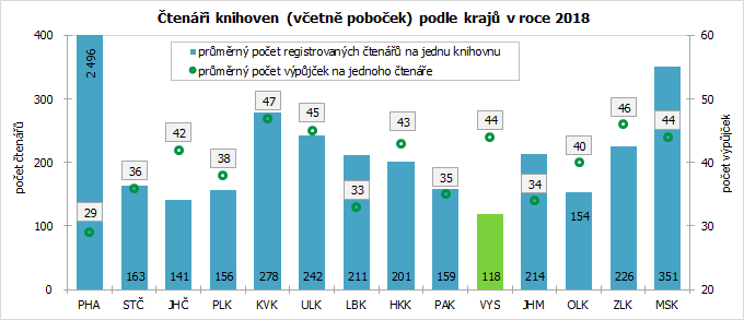 Nejvyšší počet knihoven včetně poboček byl v roce 2018 sice evidován díky vysokému počtu obcí ve Středočeském kraji (845), nejvyšší počet registrovaných čtenářů byl ale v Praze (219,7 tisíc osob). V Praze také v průměru připadalo nejvíce registrovaných čtenářů na 1 knihovnu, a to 2 496 osob. A nejaktivnější čtenáři byli v roce 2018 v Karlovarském a Zlínském kraji, kde v průměru na čtenáře připadalo 47, resp. 46 výpůjček ročně.
