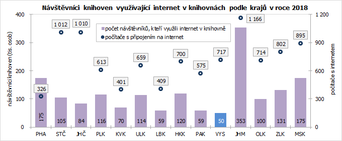 Kromě knihovního fondu jsou ve veřejných knihovnách k dispozici také počítače. V Kraji Vysočina bylo v roce 2018 pro návštěvníky knihoven připraveno 774 počítačů, z toho 717 počítačů bylo připojeno k internetu, tuto službu využilo 50 tisíc čtenářů. V knihovnách se počty počítačů celkem i s připojením na internet v kraji rok co rok snižují, stejně tak klesá i počet návštěvníků využívajících internet v knihovně. Tuto skutečnost můžeme přičíst i rozvoji mobilních technologií a stále se zvyšující vybavenosti domácností počítači a internetem.