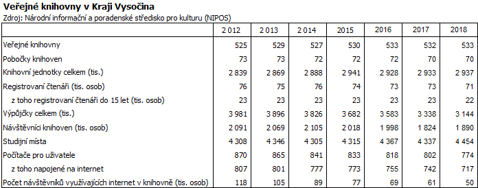 Čtenáři v Kraji Vysočina mohli v knihovnách v roce 2018 vybírat z více jak 2,9 milionu knihovních jednotek. Bylo evidováno celkem 3,1 milionu výpůjček, jejich počet se ale proti roku 2074 snížil o 194 tisíc. Registrovaný čtenář si v roce 2018 vypůjčil v průměru 44 knih.