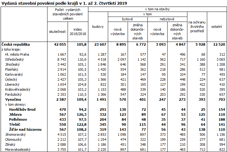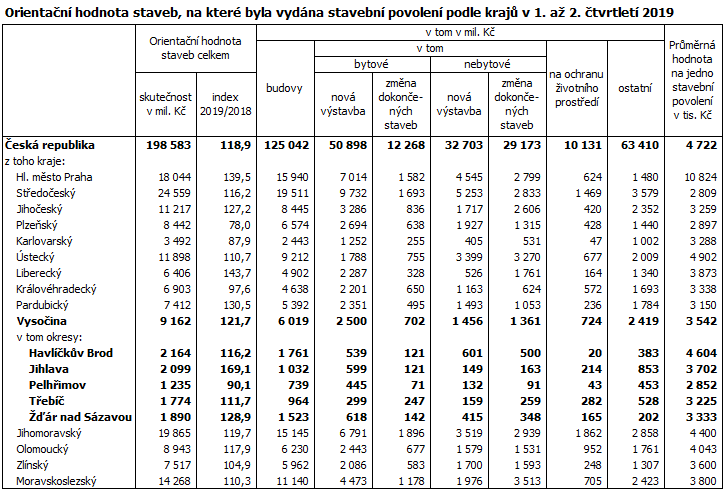 Orientační hodnota staveb, na které bylo v Kraji Vysočina v prvním a druhém čtvrtletí 2019 vydáno povolení, dosáhla výše 9 162 mil. Kč, kraj se tak v mezikrajském srovnání zařadil na sedmé místo. Oproti prvním šesti měsícům roku 2018 na Vysočině vzrostla orientační hodnota staveb o 1 635 mil. Kč (o 21,7 %). Ve srovnání s prvním pololetím 2018 se orientační hodnota staveb zvýšila v jedenácti regionech, nejvýraznější byl nárůst v Libereckém kraji (o 43,7 %), Vysočina dosáhla na páté místo. Pokles orientační hodnoty staveb byl zaznamenán ve třech krajích – zvláště výrazný byl výkyv v Plzeňském kraji (-22,0 %). K nárůstu došlo i na celorepublikové úrovni (o 18,9 %), ve srovnání s ním bylo zvýšení orientační hodnoty staveb na Vysočině o 2,8 procentního bodu výraznější.