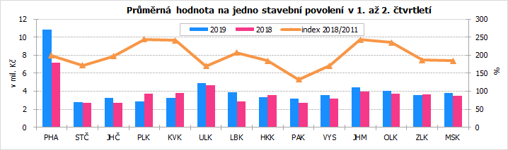 Průměrná hodnota na jedno stavební povolení činila v prvních šesti měsících roku 2019 na Vysočině 3 542 tis. Kč, což je výrazně pod republikovou úrovní (4 722 tis. Kč), v mezikrajském srovnání se jedná o osmou nejvyšší hodnotu. V rámci Vysočiny byla nejvyšší orientační hodnota na jedno stavební povolení zaznamenána v okrese Havlíčkův Brod (4 604 tis. Kč) a nejnižší v okrese Pelhřimov (2 852 tis. Kč).
