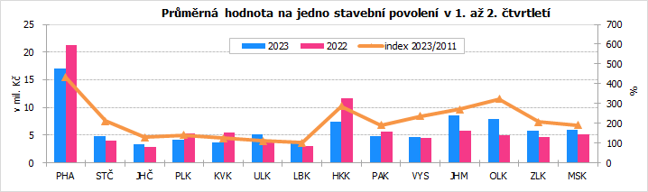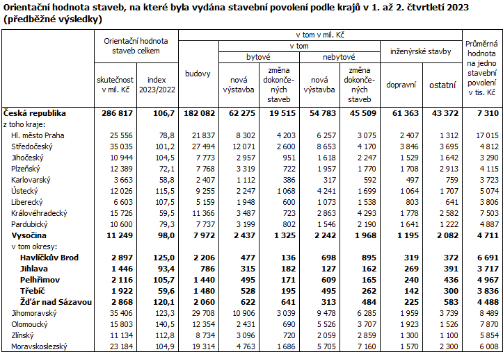Průměrná hodnota na jedno stavební povolení činila v prvních šesti měsících roku 2023 na Vysočině 4 711 tis. Kč, což je výrazně pod republikovou úrovní (7 310 tis. Kč), v mezikrajském srovnání se jedná o pátou nejnižší hodnotu. V rámci Vysočiny byla nejvyšší orientační hodnota na jedno stavební povolení zaznamenána v okrese Havlíčkův Brod (6 691 tis. Kč), naopak nejnižší v okresech Jihlava (3 717 tis. Kč) a Třebíč (3 836 tis. Kč).