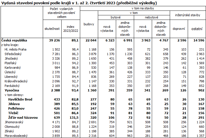 Ve srovnání s 1. pololetím roku 2022 se počet vydaných stavebních povolení na Vysočině značně snížil (o 6,6 %), v celé České republice byl pokles počtu vydaných stavebních povolení o dost hlubší (o 10,9 %). Ze stavebních povolení vystavených v lednu až červnu 2023 v kraji připadlo na budovy s byty 31,4 %, na nebytové stavby 25,5 %, na dopravní inženýrské stavby 5,3 % a na ostatní inženýrské stavby 37,8 %.