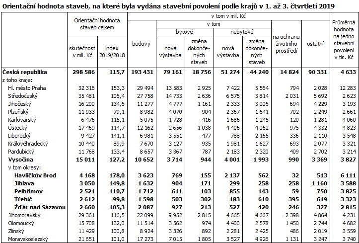 Orientační hodnota staveb, na které bylo v Kraji Vysočina v prvním až třetím čtvrtletí 2019 vydáno povolení, dosáhla výše 15 011 mil. Kč, kraj se tak v mezikrajském srovnání zařadil na osmé místo. Oproti prvním devíti měsícům roku 2018 na Vysočině vzrostla orientační hodnota staveb o 3 213 mil. Kč (o 27,2 %). Ve srovnání s prvními třemi čtvrtletími 2018 se orientační hodnota staveb zvýšila v dvanácti regionech, nejvýraznější byl nárůst v Praze (o 53,3 %), Vysočina dosáhla na šesté místo. Pokles orientační hodnoty staveb byl zaznamenán ve dvou krajích – zvláště výrazný byl výkyv v Plzeňském kraji (-20,9 %). K nárůstu došlo i na celorepublikové úrovni (o 15,7 %), ve srovnání s ním bylo zvýšení orientační hodnoty staveb na Vysočině o 11,5 procentního bodu výraznější.