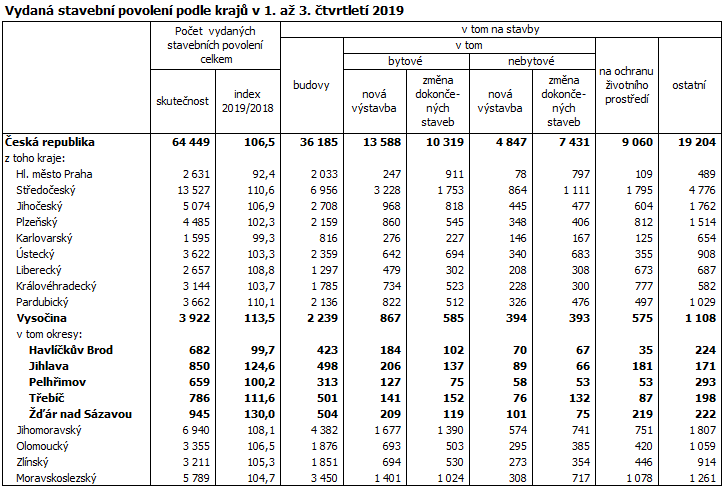V Kraji Vysočina bylo v průběhu prvních tří čtvrtletí roku 2019 vydáno 3 922 stavebních povolení. V mezikrajském srovnání to byl šestý nejvyšší počet a současně 6,1 % všech povolení vydaných v celé České republice.