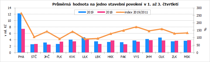 Průměrná hodnota na jedno stavební povolení činila v prvních devíti měsících roku 2019 na Vysočině 3 827 tis. Kč, což je výrazně pod republikovou úrovní (4 633 tis. Kč), v mezikrajském srovnání se jedná o šestou nejvyšší hodnotu. V rámci Vysočiny byla zdaleka nejvyšší orientační hodnota na jedno stavební povolení zaznamenána v okrese Havlíčkův Brod (6 111 tis. Kč) a nejnižší v okrese Žďár nad Sázavou (2 815 tis. Kč).