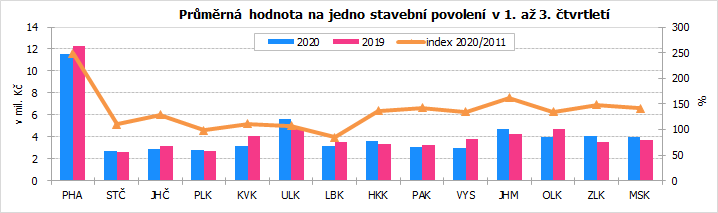 Průměrná hodnota na jedno stavební povolení činila v prvních devíti měsících roku 2020 na Vysočině 2 990 tis. Kč, což je výrazně pod republikovou úrovní (4 447 tis. Kč), v mezikrajském srovnání se jedná o čtvrtou nejnižší hodnotu. V rámci Vysočiny byla zdaleka nejvyšší orientační hodnota na jedno stavební povolení zaznamenána v okrese Havlíčkův Brod (4 230 tis. Kč) a nejnižší v okrese Jihlava (2 361 tis. Kč).