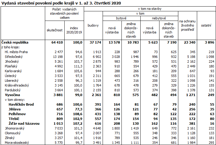 V Kraji Vysočina bylo v průběhu prvních tří čtvrtletí roku 2020 vydáno 3 881 stavebních povolení. V mezikrajském srovnání to byl šestý nejvyšší počet a současně 6,0 % všech povolení vydaných v celé České republice.