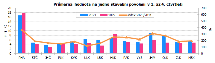 Průměrná hodnota na jedno stavební povolení činila ve dvanácti měsících roku 2023 na Vysočině 4 854 tis. Kč, což je výrazně pod republikovou úrovní (7 773 tis. Kč), v mezikrajském srovnání se jedná o čtvrtou nejnižší hodnotu. V rámci Vysočiny byla nejvyšší orientační hodnota na jedno stavební povolení zaznamenána v okrese Havlíčkův Brod (6 470 tis. Kč), naopak nejnižší v okrese Jihlava (3 718 tis. Kč).