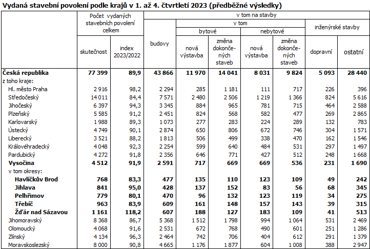 Ve srovnání s 1. až 4. čtvrtletím roku 2022 se počet vydaných stavebních povolení na Vysočině značně snížil (o 8,1 %), v celé České republice byl pokles počtu vydaných stavebních povolení ještě vyšší (o 10,1 %). Ze stavebních povolení vystavených v lednu až prosinci 2023 v kraji připadlo na budovy s byty 30,7 %, na nebytové stavby 26,7 %, na dopravní inženýrské stavby 5,1 % a na ostatní inženýrské stavby 37,5 %.