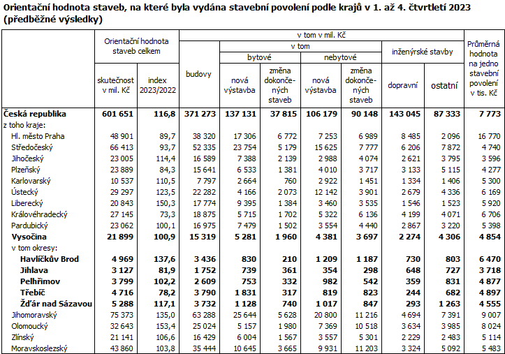 Orientační hodnota staveb, na které bylo v Kraji Vysočina v 1. až 4. čtvrtletí 2023 vydáno povolení, dosáhla výše 21 899 mil. Kč, v mezikrajském srovnání šlo o čtvrtou nejnižší hodnotu. Oproti dvanácti měsícům roku 2022 se na Vysočině orientační hodnota staveb zvýšila o 204 mil. Kč (o 0,9 %). Ve srovnání s 1. až 4. čtvrtletím 2022 se orientační hodnota staveb zvýšila v deseti regionech, nejvýrazněji v Olomouckém kraji. K poklesu orientační hodnoty staveb došlo ve čtyřech, zejména v Královéhradeckém (o 26,7 %). Na celorepublikové úrovni došlo ke zvýšení orientační hodnoty staveb o 16,8 %, ve srovnání s tím byla změna hodnoty staveb na Vysočině o 15,9 procentního bodu nižší.