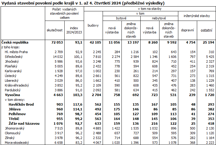 Ve srovnání s 1. až 4. čtvrtletím roku 2023 se počet vydaných stavebních povolení na Vysočině zvýšil o 3,3 %, v celé České republice naopak pokračoval pokles počtu vydaných stavebních povolení (o 6,9 %). Ze stavebních povolení vystavených v lednu až prosinci 2024 v kraji připadlo na budovy s byty 31,1 %, na nebytové stavby 26,9 %, na dopravní inženýrské stavby 5,1 % a na ostatní inženýrské stavby 36,9 %.