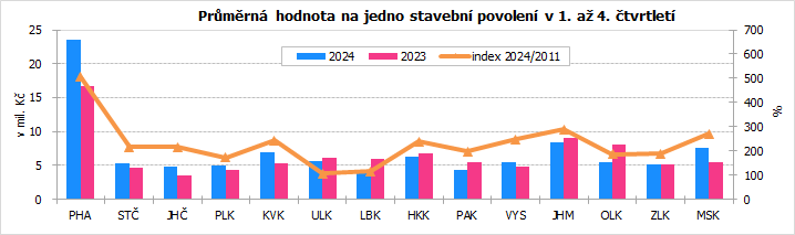 Průměrná hodnota na jedno stavební povolení činila v dvanácti měsících roku 2024 na Vysočině 5 493 tis. Kč, což je výrazně pod republikovou úrovní (8 046 tis. Kč), v mezikrajském srovnání se jedná o osmou nejvyšší hodnotu. V rámci Vysočiny byla nejvyšší orientační hodnota na jedno stavební povolení zaznamenána v okrese Žďár nad Sázavou (6 073 tis. Kč), naopak nejnižší v okrese Havlíčkův Brod (4 741 tis. Kč).