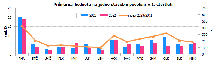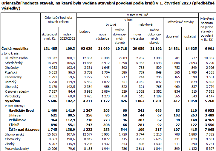 Průměrná hodnota na jedno stavební povolení činila v prvních třech měsících roku 2023 na Vysočině 5 260 tis. Kč, což je výrazně pod republikovou úrovní (6 901 tis. Kč), v mezikrajském srovnání se jedná o šestou nejnižší hodnotu. V rámci Vysočiny byla nejvyšší orientační hodnota na jedno stavební povolení zaznamenána v okrese Žďár nad Sázavou (7 065 tis. Kč), naopak nejnižší v okresech Jihlava (3 489 tis. Kč) a Třebíč (3 556 tis. Kč).