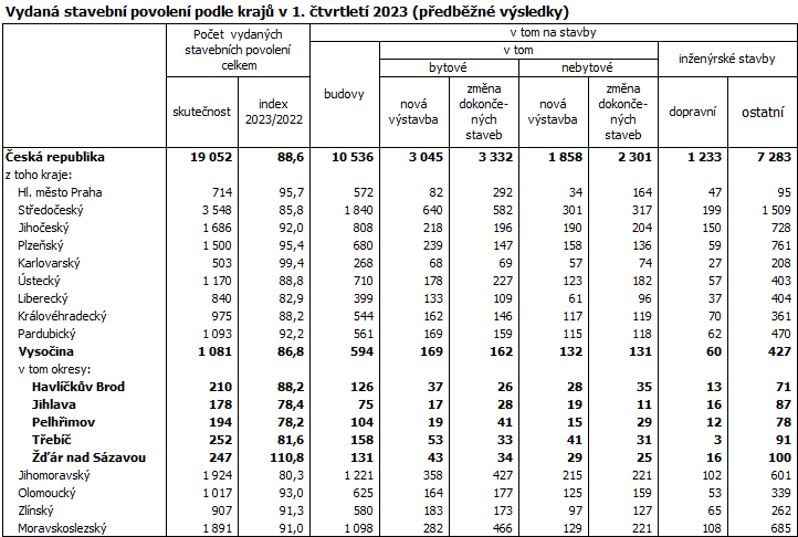 Ve srovnání s 1. čtvrtletím roku 2022 se počet vydaných stavebních povolení na Vysočině výrazně snížil (o 13,2 %), v celé České republice byl pokles počtu vydaných stavebních povolení o něco mírnější (o 11,4 %). Ze stavebních povolení vystavených v lednu až březnu 2023 v kraji připadlo na budovy s byty 30,6 %, na nebytové stavby 24,4 %, na dopravní inženýrské stavby 5,6 % a na ostatní inženýrské stavby 39,5 %.