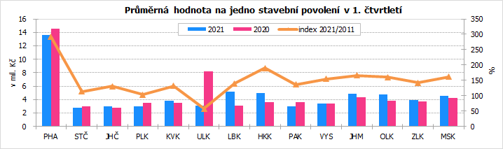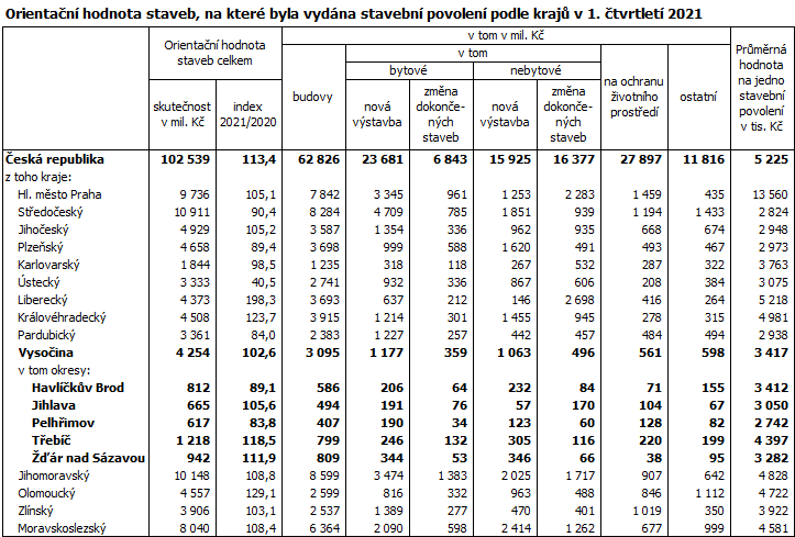 Průměrná hodnota na jedno stavební povolení činila v prvních třech měsících roku 2021 na Vysočině 3 417 tis. Kč, což je výrazně pod republikovou úrovní (5 225 tis. Kč), v mezikrajském srovnání se jedná o šestou nejnižší hodnotu. V rámci Vysočiny byla nejvyšší orientační hodnota na jedno stavební povolení zaznamenána v okrese Třebíč (4 397 tis. Kč), naopak nejnižší v okrese Pelhřimov (2 742 tis. Kč).