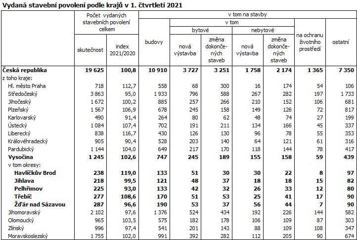 V Kraji Vysočina bylo v průběhu prvního čtvrtletí roku 2021 vydáno 1 245 stavebních povolení. V mezikrajském srovnání to byl šestý nejvyšší počet a současně 6,3 % všech povolení vydaných v celé České republice.