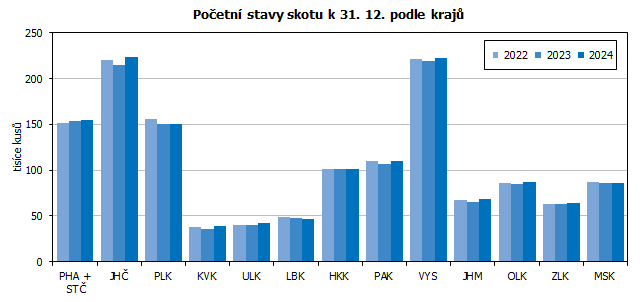 Pomocí výběrových šetření o chovu skotu, prasat a drůbeže byly k 31. 12. 2024 zpracovány důležité charakteristiky živočišné výroby. Počet chovaného skotu v České republice se meziročně zvýšil o 2 % a stavy prasat vzrostly o 4,4 %. Drůbeže bylo chováno o 17,8 % více než v předchozím roce. Pro Kraj Vysočina byly zjištěny tyto hodnoty: