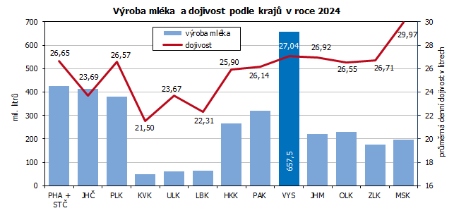 V průběhu roku 2024 bylo v kraji vyrobeno 657,5 mil. litrů mléka, což představuje téměř jednu pětinu produkce mléka v ČR. Ve srovnání s předchozím rokem se množství vyrobeného mléka zvýšilo téměř o 20 mil. litrů (+3,1 %). Počet dojených krav se v meziročním srovnání změnil pouze nepatrně, tudíž měla na větší výrobu mléka vliv zejména vyšší užitkovost dojených krav. Průměrná roční dojivost 1 dojnice se zvýšila o 277 litrů na úroveň 9 898 litrů. Průměrná denní dojivost meziročně vzrostla o 2,6 % na 27,04 litrů a je z pohledu celé České republiky nadprůměrná (průměr v ČR je 26,16 litrů).