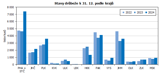 Stavy drůbeže k 31. prosinci 2024 v rámci ČR zaznamenaly ve srovnání s předchozím rokem růst o více než 3,9 milionů kusů (17,8 %). V Kraji Vysočina došlo ke zvýšení počtu drůbeže o více než 387 tisíc kusů (71,6 %). Vysočinské hejno drůbeže patří v mezikrajském srovnání však spíše k těm menším a představuje necelý 3,6% podíl na celorepublikovém množství drůbeže. K 31. 12. 2024 bylo v kraji chováno necelých 928 tis. kusů drůbeže. Nosnice představují v tomto množství 0,6 %, tj. 5 193 ks. Produkce konzumních vajec dosáhla od počátku roku jen 1,1 mil. kusů a proti roku 2023 se snížila na polovinu (-52,7 %). Za poklesem snášky konzumních vajec stojí zejména výrazné meziroční snížení počtu chovaných nosnic (-55,8 %). To nevyrovnala ani o 1,5 % meziročně vyšší průměrná snáška na nosnici (207,7 kusů vajec za rok).