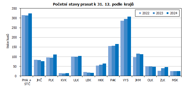 K 31. prosinci 2024 bylo na Vysočině chováno 308 245 kusů prasat. V mezikrajském srovnání se jedná po Praze a Středočeském kraji o druhé nejvyšší stavy prasat (21,7 % z celé ČR). V meziročním srovnání sledujeme přírůstek o 13 tisíc kusů (+4,4 %). K nárůstu dochází u všech kategorií prasat, v absolutním vyjádření zejména u prasat na výkrm. Prasnice představovaly 5,3 % z celkového stáda prasat. Narozeno bylo 688 361 selat, skoro o 20 tis. ks více než v předchozím roce. Na jednu prasnici se v roce 2024 narodilo 35,6 selat, přičemž jejich úhyn vztažený k počtu narozených klesl o 0,3 % bodu na úroveň 11,7 %, což je o 1 procentní bod nad průměrem ČR.
